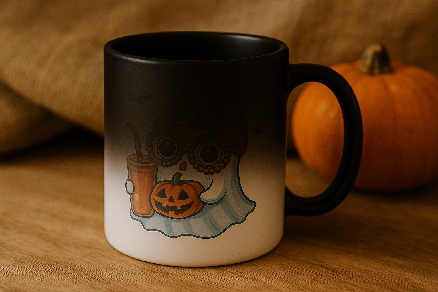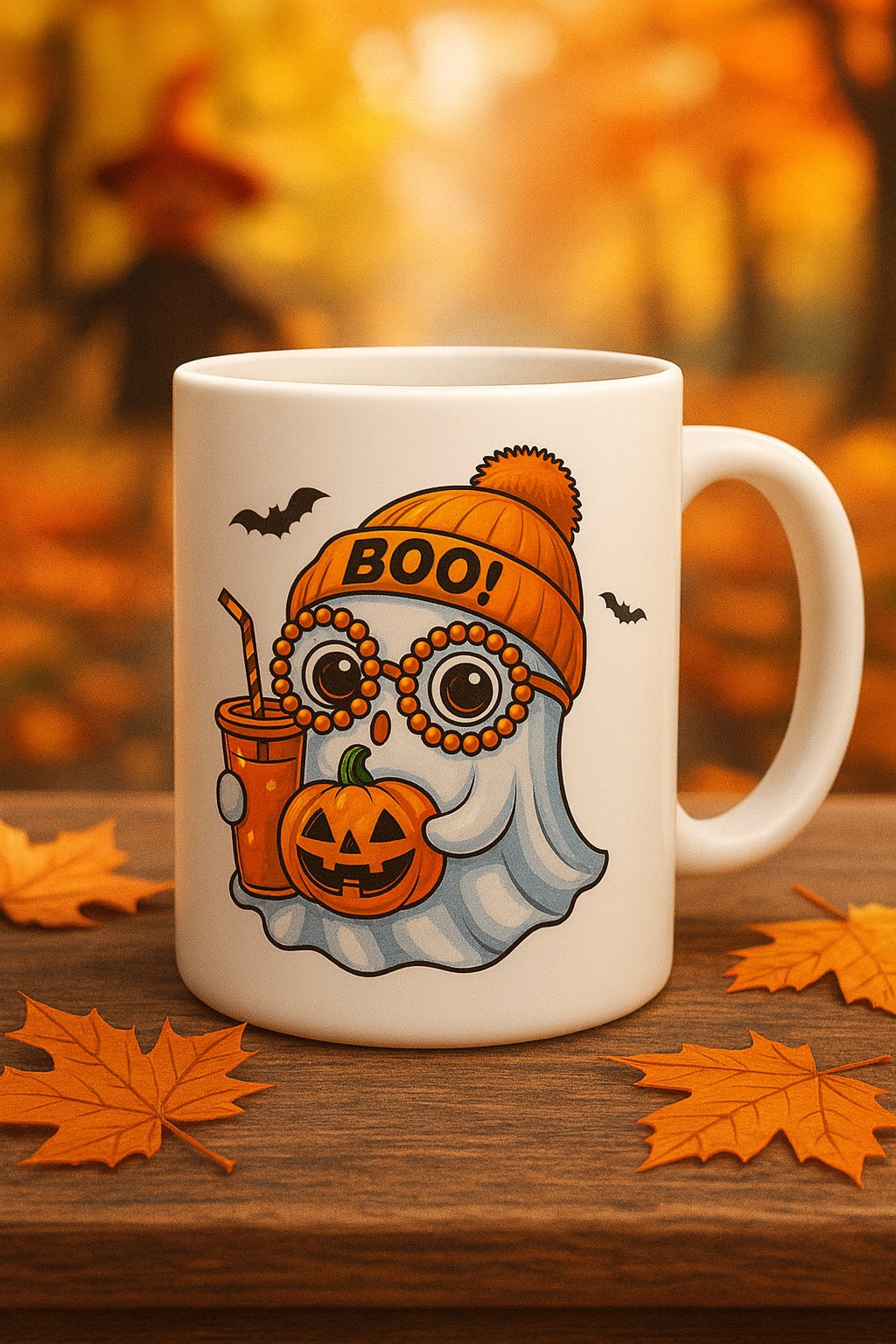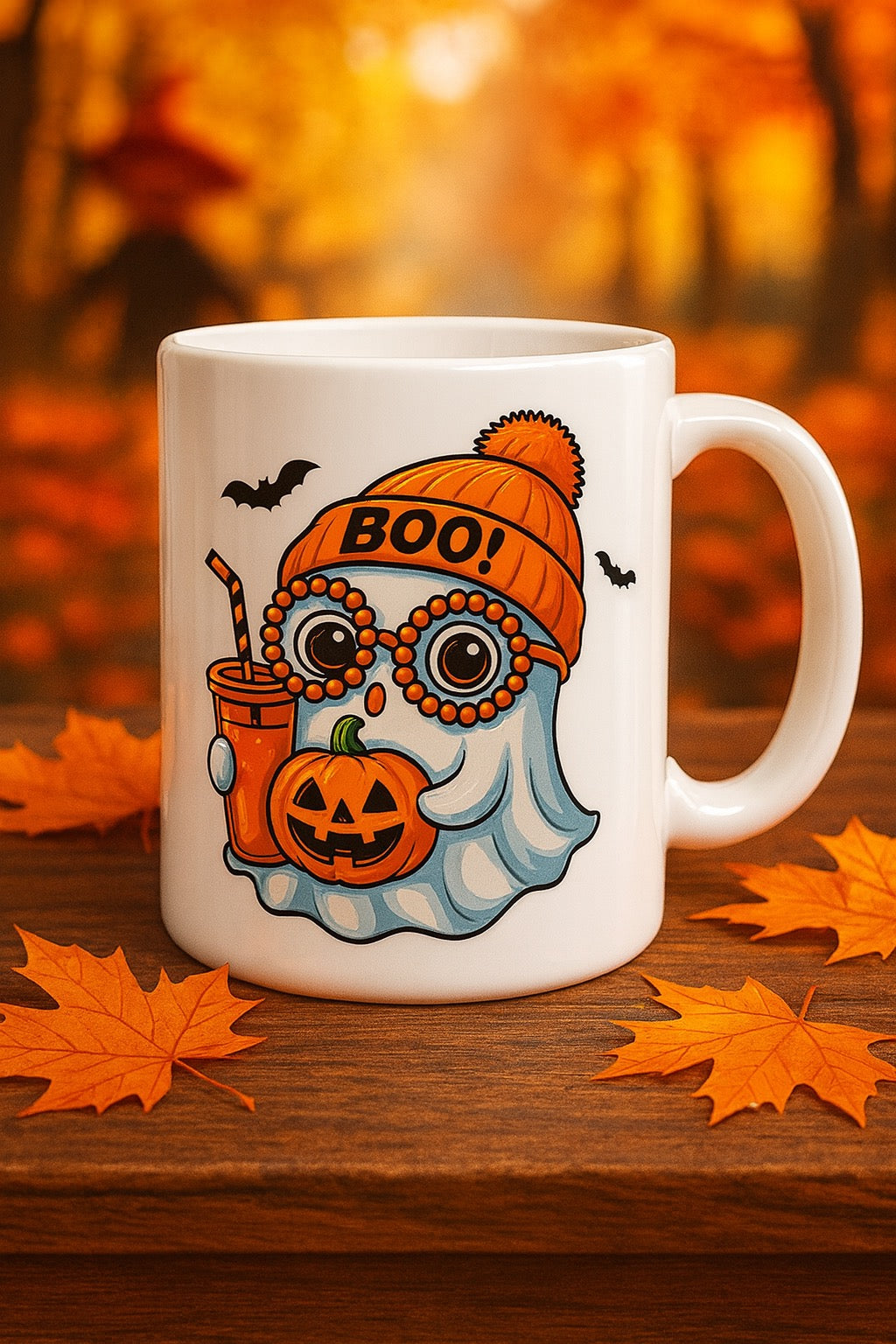 🎃 Halloween-Tasse "Boo!" – Süßer Geist mit Kürbis & Herbstdrink