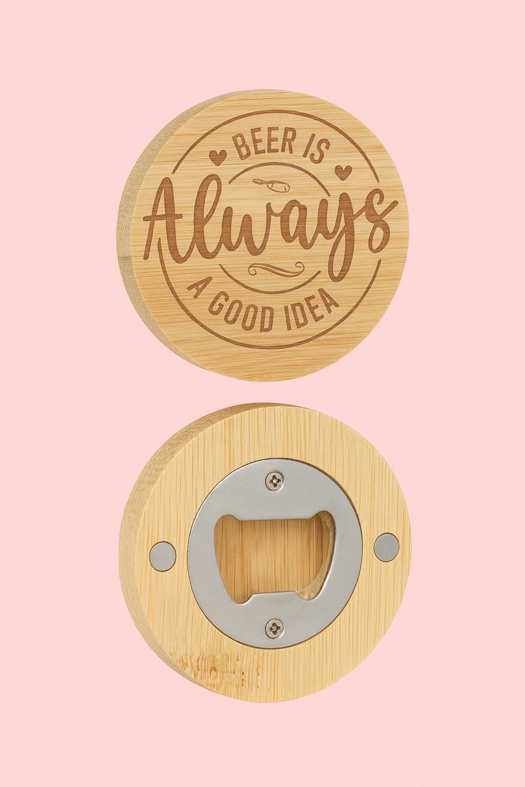 Runder Flaschenöffner aus Bambus – „Beer is Always a Good Idea“